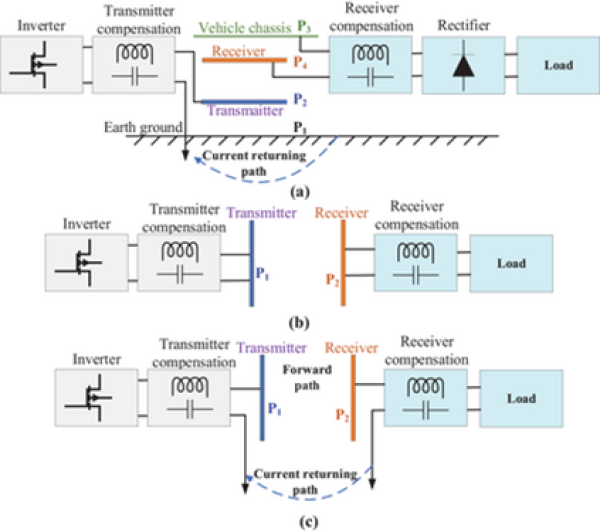 The two-plate structure for EV’s uses a parasitic capacitance between the EV chassis and the ground to create a returning path for the current to follow, resulting in reduced system losses. A prototype system achieved a DC-DC efficiency of 70% with a power transfer of 350W over an airgap of 110mm. The single -wire application consists of a power transmitter, power receiver, and a load. There is no physical path for the current to return, so the system depends on the voltage difference between the terminals. Because of this, it allows for greater tolerance in misalignment ranges. With quasi-wireless two-plate structures (Figure 26c) only two plates are used for the forward current path, while the returning current’s path is established by the earth ground. There are realised quasi-wireless two plate structure setups with a power transmission over an airgap of two meters.