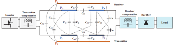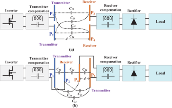 Distance d in the horizontal four-plate structure should be increased to minimize the effects of the parasitic capacitances. In this structure, the self-coupled capacitances small which in turn reduces the self-capacitance. However, this structure is highly sensitive to rotational misalignments. For instance, when there is a phase shift of 90 degrees between the transmitting and receiving plates, the system power reaches zero. This limits the use of this structure. The vertical four-plate architecture, as shown in the figure above, is characterized by a smaller distance between plates P3 and P4. Plate P1 is positioned close to plate P2. This eliminates external and internal capacitances and increases self-capacitances. Plates P1 and P3 are made much larger than plates P2 and P4 to ensure coupling between each set of plates. The close proximity of plates P1and P2, as well as P3 and P4, significantly increases the capacitances C12 and C34. Compared to a horizontal four-plate architecture, the vertical four-plate architecture offers better consolidation and is particularly suitable for rotational misalignment when the plates are straight at the centre, especially in a circular configuration. However, this architecture has drawbacks such as low cross-coupling capacitance, leading to increased cross-coupled capacitances and lower efficiency compared to the horizontal four-plate architecture. Also, the voltage stress is high, requiring the metal plates to be covered with a good insulating material.