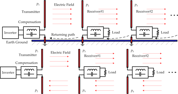When the transfer distance needs to be increased, the concept of the electric field repeater can be used. In the upper part of the figure below, a two-plate electric field repeater is shown. P1 is used as a power transmitter while P2 and P3 are the receivers. The receivers can also function as a repeater to continuously increase the transfer distance. Because of its connection with the earth ground, this setup can be viewed as a quasi-wireless repeater system.