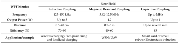 Near-field WPT is realised by a magnetic or electric field (IPT/CPT), whereas far-field WPT uses electromagnetic waves in the form of a radio frequency signal to transfer energy. Both techniques differ primarily in the distance between transmitter and receiver over which energy is transmitted. The range of near-field applications is typically limited to a few millimetres to a few centimetres, while far-field WPT extends from several metres to kilometres. Another key distinction is the alignment requirement between the transmitter and receiver. Near-field technology requires precise alignment, whereas far-field WPT does not. However, the most significant difference between the two methods lies in their efficiency.