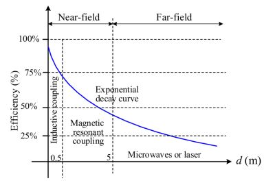 Near-field WPT is realised by a magnetic or electric field (IPT/CPT), whereas far-field WPT uses electromagnetic waves in the form of a radio frequency signal to transfer energy. Both techniques differ primarily in the distance between transmitter and receiver over which energy is transmitted. The range of near-field applications is typically limited to a few millimetres to a few centimetres, while far-field WPT extends from several metres to kilometres. Another key distinction is the alignment requirement between the transmitter and receiver. Near-field technology requires precise alignment, whereas far-field WPT does not. However, the most significant difference between the two methods lies in their efficiency.