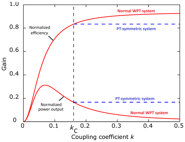 These two equations indicitate the important aspect of parity-time symmetric WPT: both the output power and efficiency are constant, i.e., independent on the coupling factor $k$, in the exact symmetric PT-region ($k \geq k_c$).
